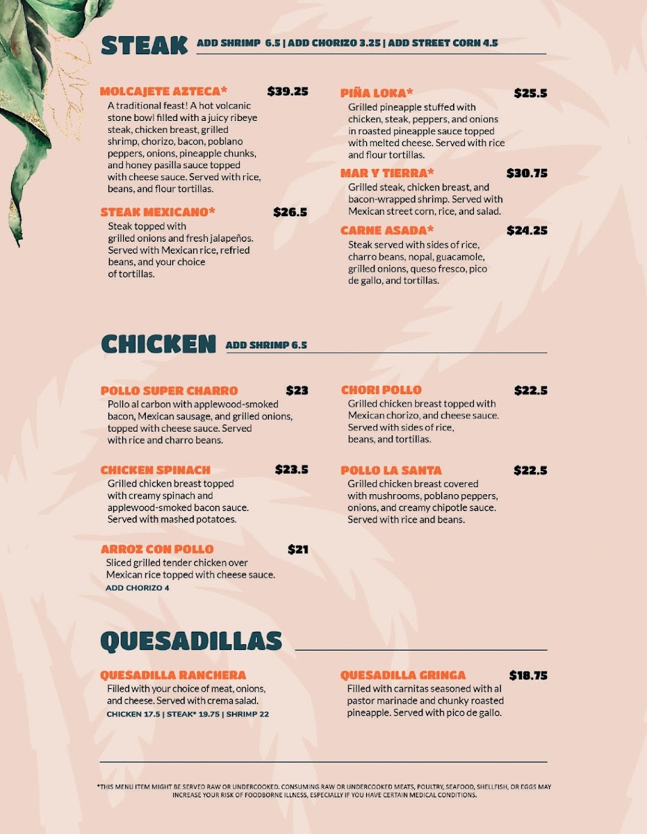A traditional feast a hot volcanic stone bowl filled with a juicy ribeye steak, chicken breast, grilled shrimp, chorizo, bacon, poblano peppers, onions, pineapple chunks, and honey pasilla sauce topped with cheese sauce. served with rice, beans, and flour tortillas. consuming raw or undercooked meats, poultry, seafood, shellfish, or eggs may increase your risk of foodborne illness, especially if you have certain medical conditions.