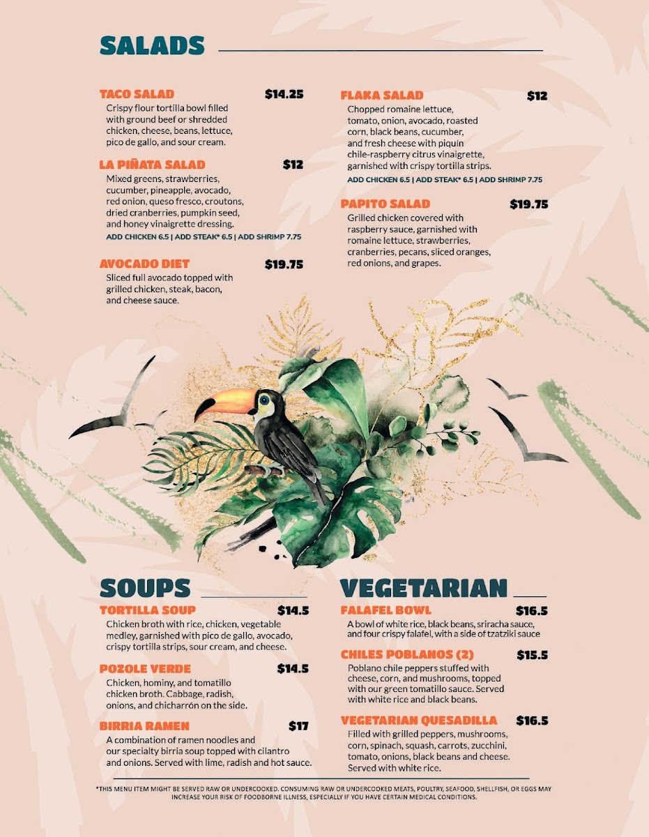 Chicken broth with rice, shredded chicken, vegetable medley, garnished with pico de gallo, avocado, crispy tortilla strips, sour cream, and cheese.