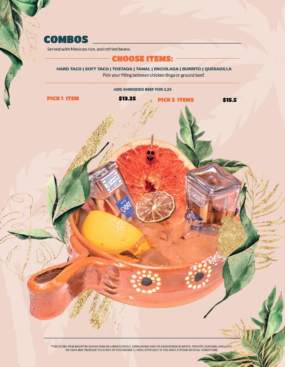 Choose items: hard taco, soft taco, tostada, tamal, enchilada, burrito, quesadilla. pick your filling between chicken tinga or ground beef. add shredded beef for an additional charge.